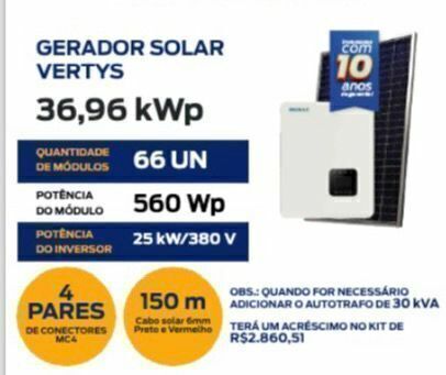 GERADOR SOLAR MH 36,96 KWp, 66 PLACAS DE MÓDULO, COM POTÊNCIA DO MÓDULO 560 Wp, POTÊNCIA DO INVERSOR 25KW/380V, 4 PARES DE CONECTORES MC4, 150m CABO SOLAR 6mm PRETO E VERMELHO... INSTALADO EM CERÂMICO, FIBROCIMENTO, METÁLICO, LAJE, SOLO...